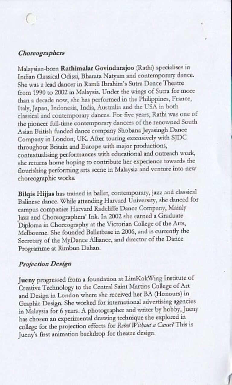 - Dancers:Regina Toyad, Denise Tan, Tara Thean Mei Feng, Yuka Tanaka, Janice Yong, Bilqis Hijjas