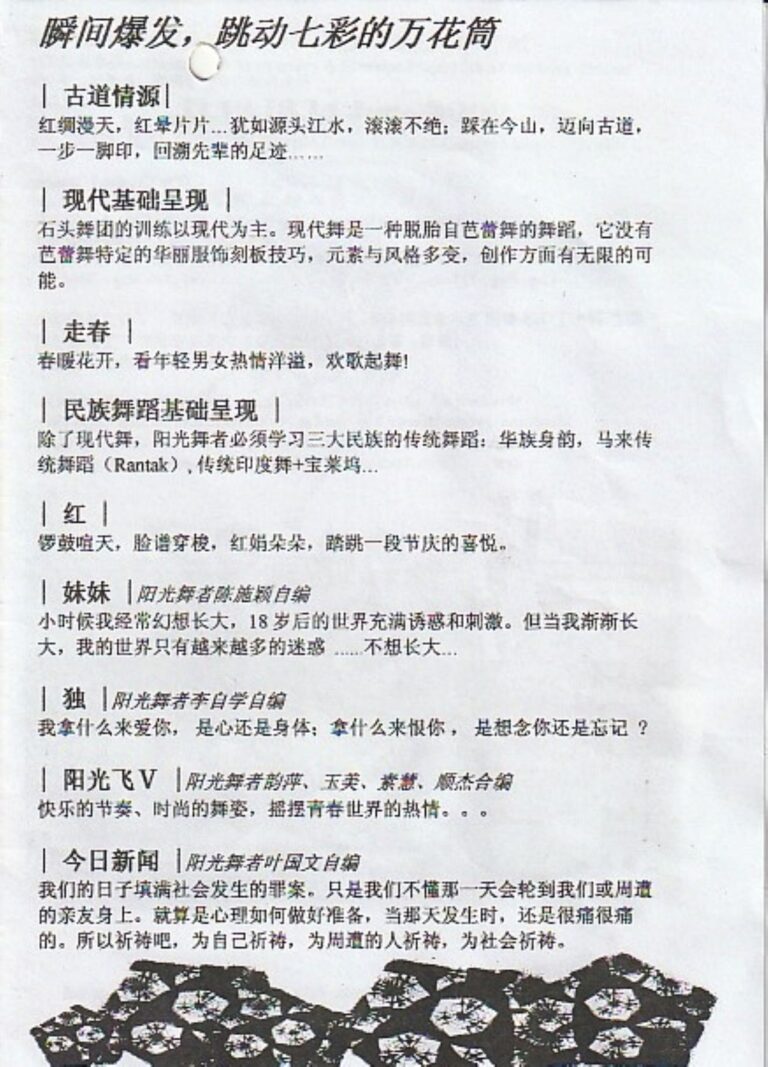- Dancers:Yap Yen Fah, Sey Pah Leh, Lee Kien Fei, Yin Shan, Ching Shuang, Ahroy Yap, Shake, SheaYee, Shun Jie, Shi Hui, Yee Mei, Ying Ping, Yi Ling, Yong Shi, See Yin, Samantha Koay, Poh May, Woei Teng
