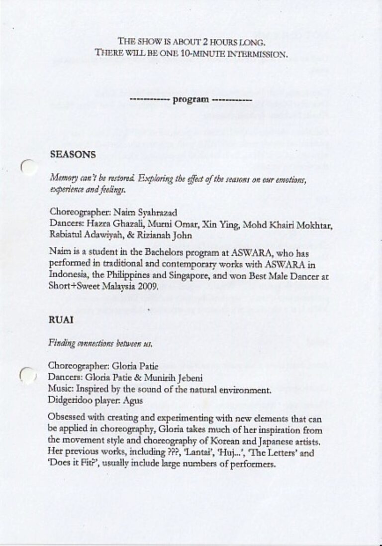 - Dancers:Hazra Ghazali, Murni Omar, Xin Ying, Mohd Khairi Mokhtar, Rabiatul Adawiyah & Riziniah John