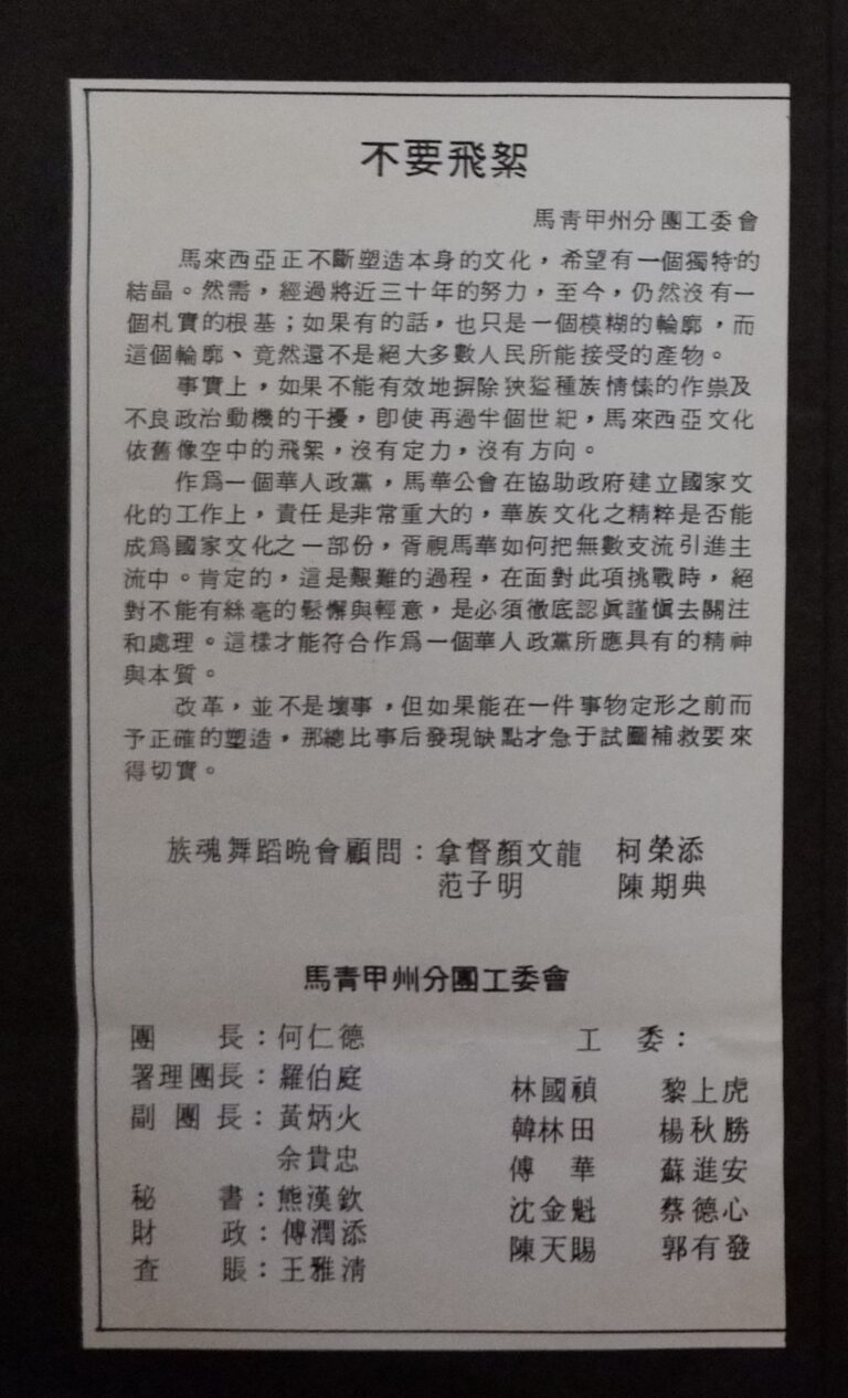 Troupe dancers include: 鍾永強 Chong Yoon Keong、何淑冰、李福明、賴燕萍、葉亞才、許龍光、覃桂妹、吳素玲、蔡嚴慶、張永福、張凌葆、李新花、魏童妞、吳光平、王金鈴、黃日紅、章品柔、黃種欽、徐亞烈、章品莊、吳瑞英、熊秀蓉、王炳炎、吳素珠、吳水妹、蔡亞發、鍾觀英。