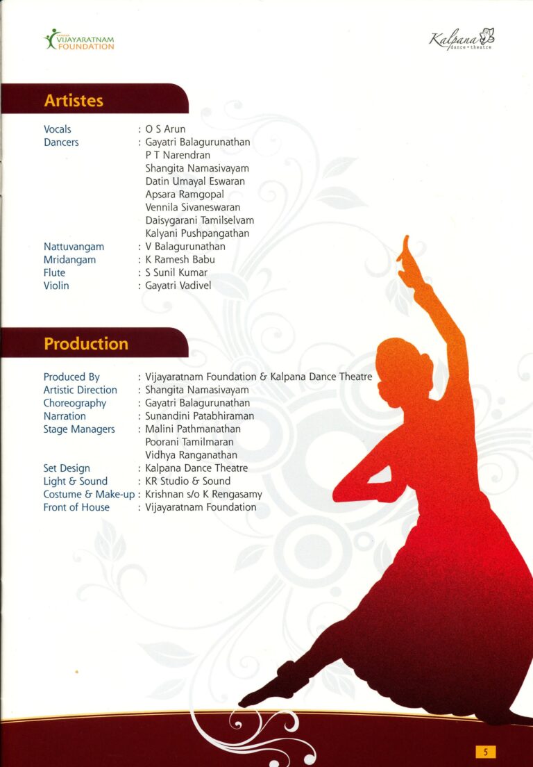 - Penari:Gayatri Balagurunathan, P T Narendran, Shangita Namasivayam, Datin Umayal Eswaran, Apsara Ramgopal, Vennila Sivaneswaran, Daisygarani Tamilselvam, Kalyani Pushpangathan