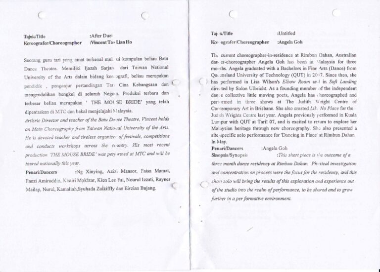 This short piece is the outcome of a three month dance residence at Rimbun Dahan. Physical investigation and concentration on process were the focus for the residency, and this short solo will bring the results of this exploration and experience out of the studio into the realm of performance, to be shared and to grow further in a performative environment.