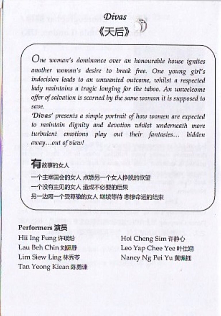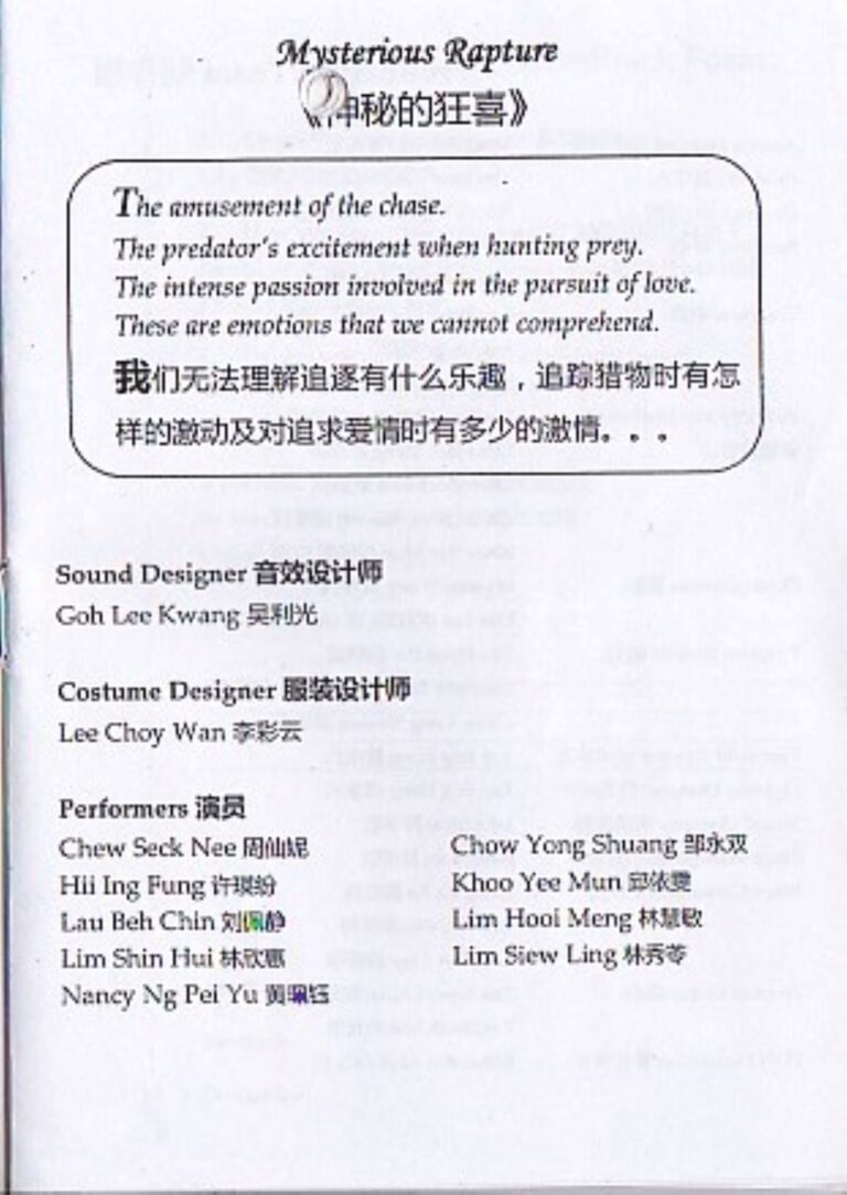• Penari:Hii Ing Fung, Lau Beh Chin, Lim Siew Ling, Tan Yeong Kiean, Hoi Cheng Sim, Leo Yap Chee Yee, Nancy Ng Pei Yu