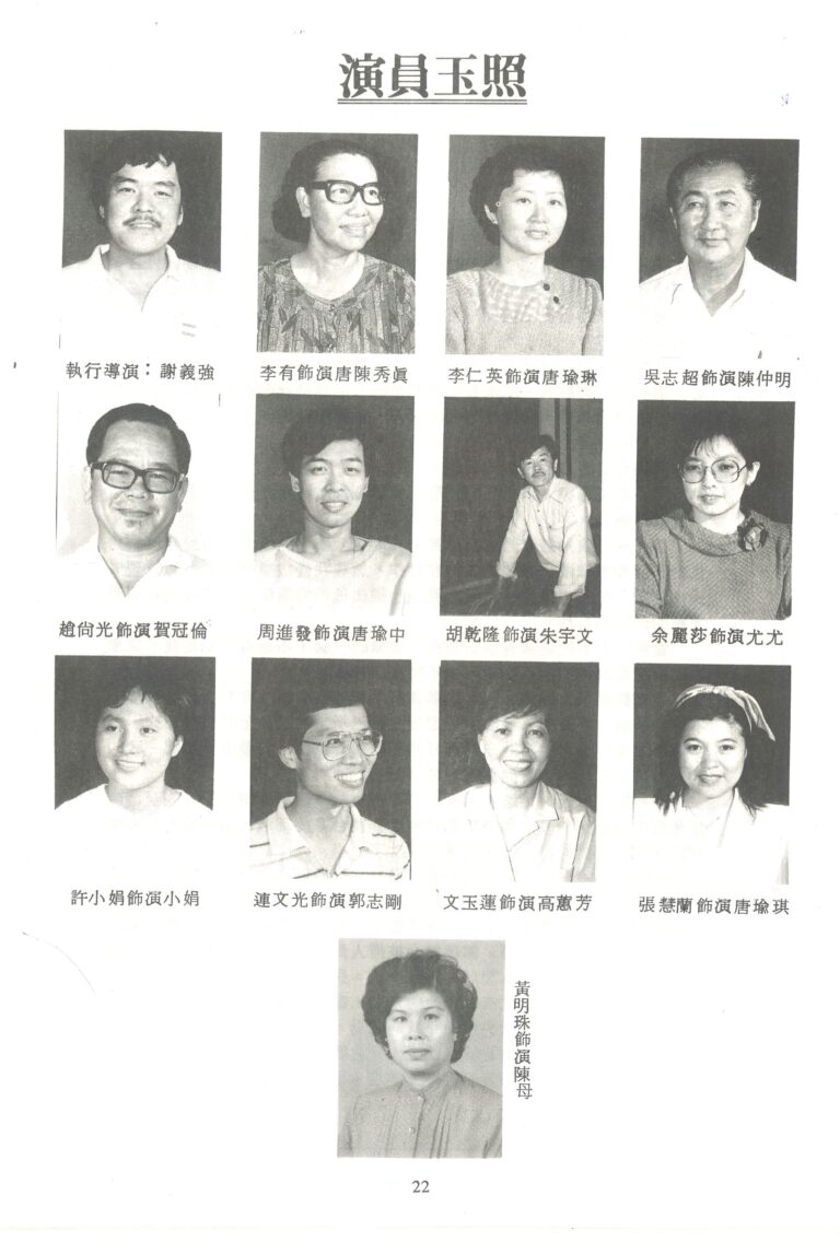 Wong Ming Choo 黃明珠, Wu Chee Chow 吳志超, Chew Chin Huat 周進發, Elisa Wong, Lian Moon Kwong 連文光, 趙商光 (Zhao Shang Guang), 胡乾隆 (Hu Qian Long), 余麗沙 (Yu Li Sha), 許小娟 (Xu Xiao Juan), 文玉蓮 (Wen Yu Lian), 張慧蘭 (Zhang Hui Lan)