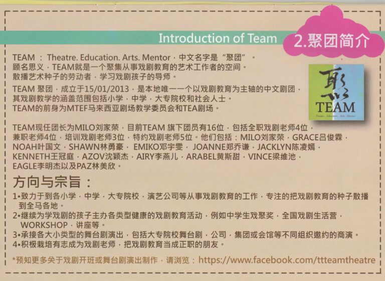 - Nama Kumpulan:TEAM Theatre (TEAM聚團)