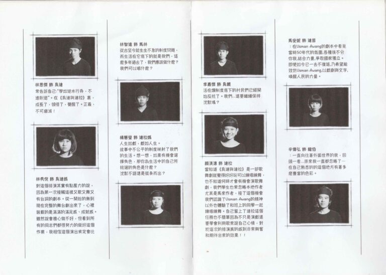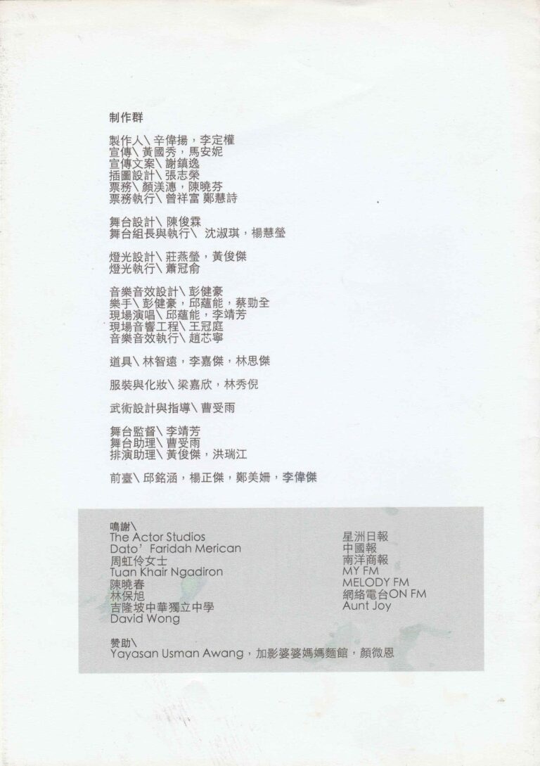 Lim Si Jie 林思傑, Gan Mei Wei 顏渼潓, Lim Chee Yuen 林智遠, Wong Kuok Siew 黃國秀, Lee Chin Fang 李靖芳, Sim Soo Kee 沈淑琪, Ang Swee Jiang 洪瑞江, Wong Jun Kiat 黃俊傑, Leong Kar Yan 梁嘉欣, Ma Onn Ny 馬安妮, Lee Jia Jie 李嘉傑, Lee Ting Kuan 李定權, Yoong Fei Yin 楊慧瑩, Seng Wei Hong 辛偉弘, Seng Wei Yang 辛偉揚, Lim Shiow Ni 林秀倪, Cho Shou Yu 曹受雨, Chern Yan Ying 莊燕瑩, Tang Shiau Fen 陳曉芬, Niko Hiew 邱蘊能
