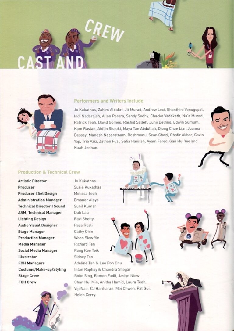 Jo Kukathas, Zahim Albakri, Jit Murad, Andrew Leci, Shanthini Venugopal, Indi Nadarajah, Allan Perera, Sandy Sodhy, Chacko Vadaketh, Na’a Murad, Patrick Teoh, David Gomes, Rashid Salleh, Junji Delfino, Edwin Sumun, Kam Raslan, Afdlin Shauki, Maya Tan Abdullah, Diong Chae Lian, Joanna Bessey, Manesh Nesaratnam, Reshmonu, Sean Ghazi, Ghafir Akbar, Gavin Yap, Tria Aziz, Zalfian Fuzi, Safia Hanifah, Ayam Fared, Gan Hui Yee and Kuah Jenhan
