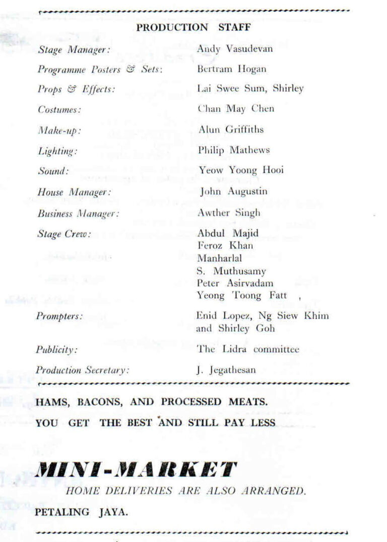 - Kru Pentas:Abdul Majid, Feroz Khan, Manharlal, S. Muthusamy, Peter Asirvadam, Yeong Toong Fatt