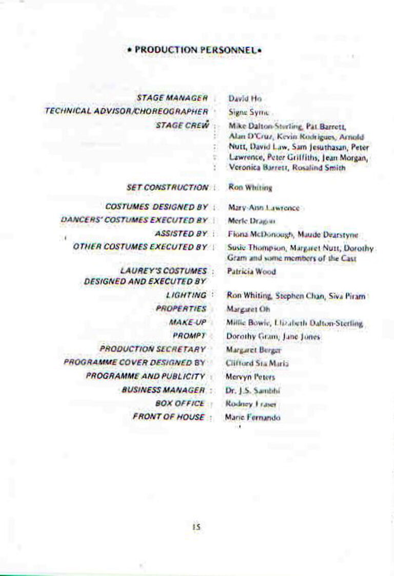 • Kru Pentas:Mike Dalton-Sterling, Pat Barrett, Alan D’Cruz, Kevin Rodrigues, Arnold Nutt, David Law, Sam Jesuthasan, Peter Lawrence, Peter Griffiths, Jean Morgan, Veronica Barrett, Rosalind Smith