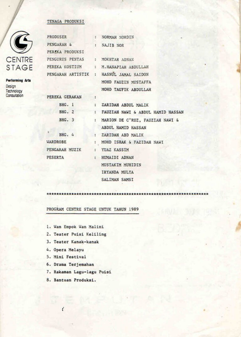 - Tempat Pementasan:Pusat Kreatif Balai Seni Lukis Negara