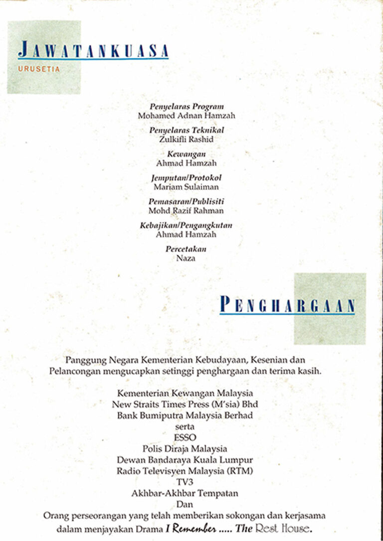 PANGGUNG NEGARA, Kementerian Kebudayaan, Kesenian dan Perlancongan Malaysia mempersembahkan I Remember…The Rest house