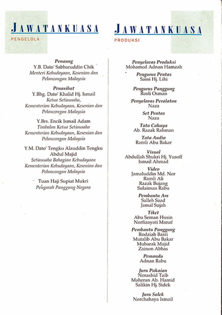 Pembantu Panggung/ Theatre Assistant: Mutalib Abu Bakar,Rodziah Basri, Mubarak Majid, Zainon Abbas
