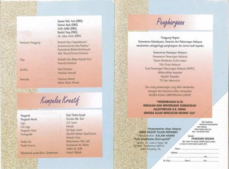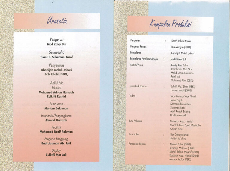 • Kru Pentas:DBKL: Ahmad Bakar, Izzudin Mokhtar, MOhd. Takrim Maarof, Rodzuan Abd. Hamid, Mansor Jaafar, Sapeai Abd. Aziz, Darawi Ayub, Arifin Salleh, Rashidi Yeop, Ab. Jabar Aman