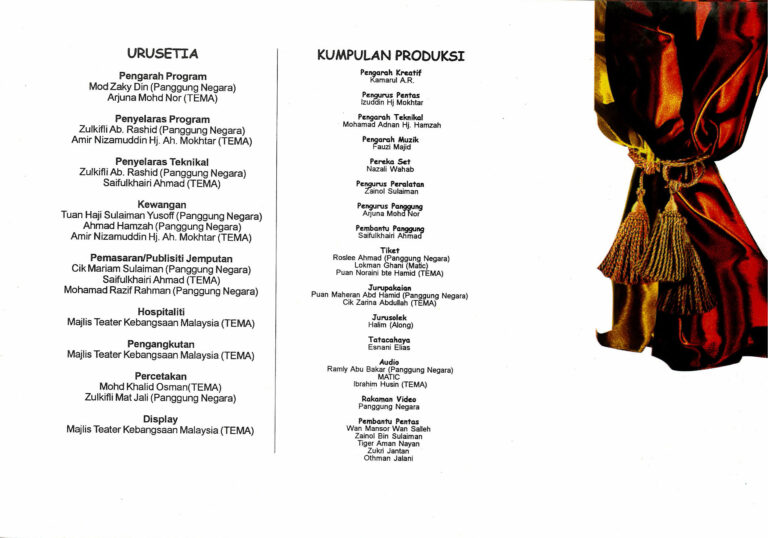 Penyelaras Produksi/ Production Coordinator: Zulkifli Ab. Rashid (Panggung Budaya), Amir Nizamuddin Hj. Ah. Mokhtar (TEMA)