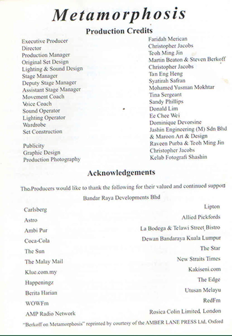 - Kru Pentas:Sound: Donald LimLighting: Ee Chee Wei