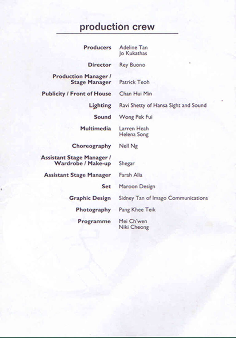 - Kru Pentas:Wardrobe: Shegar Sound: Wong Pek Fui