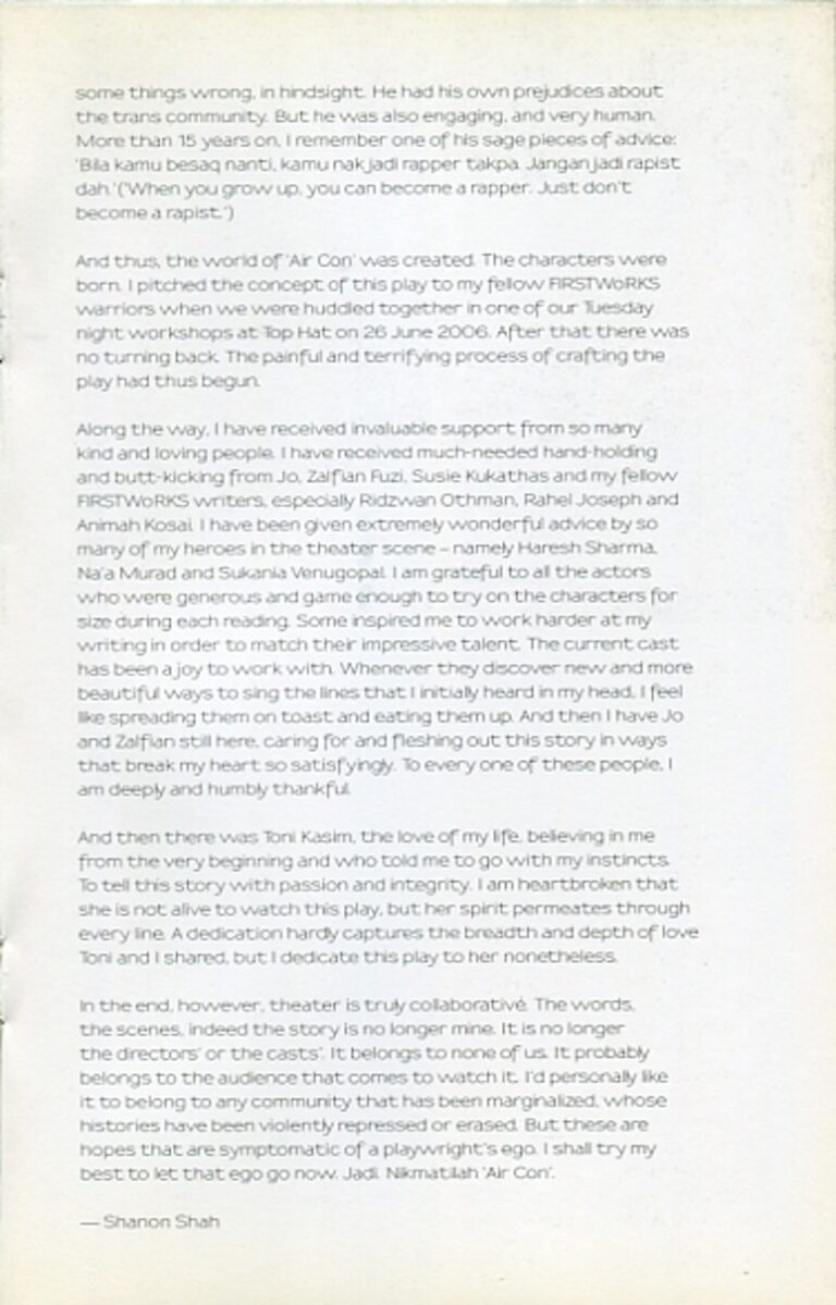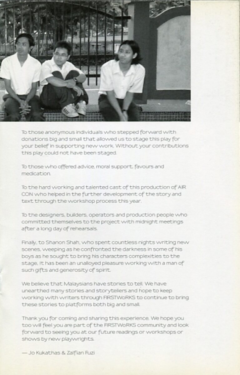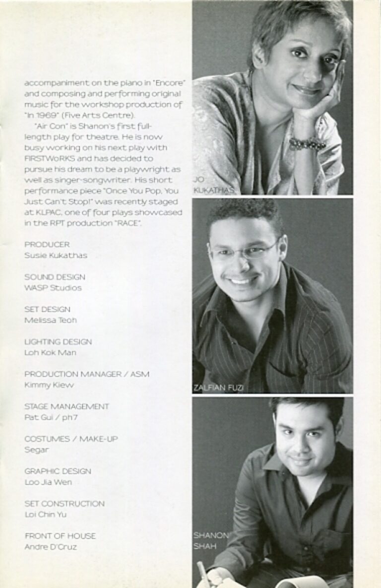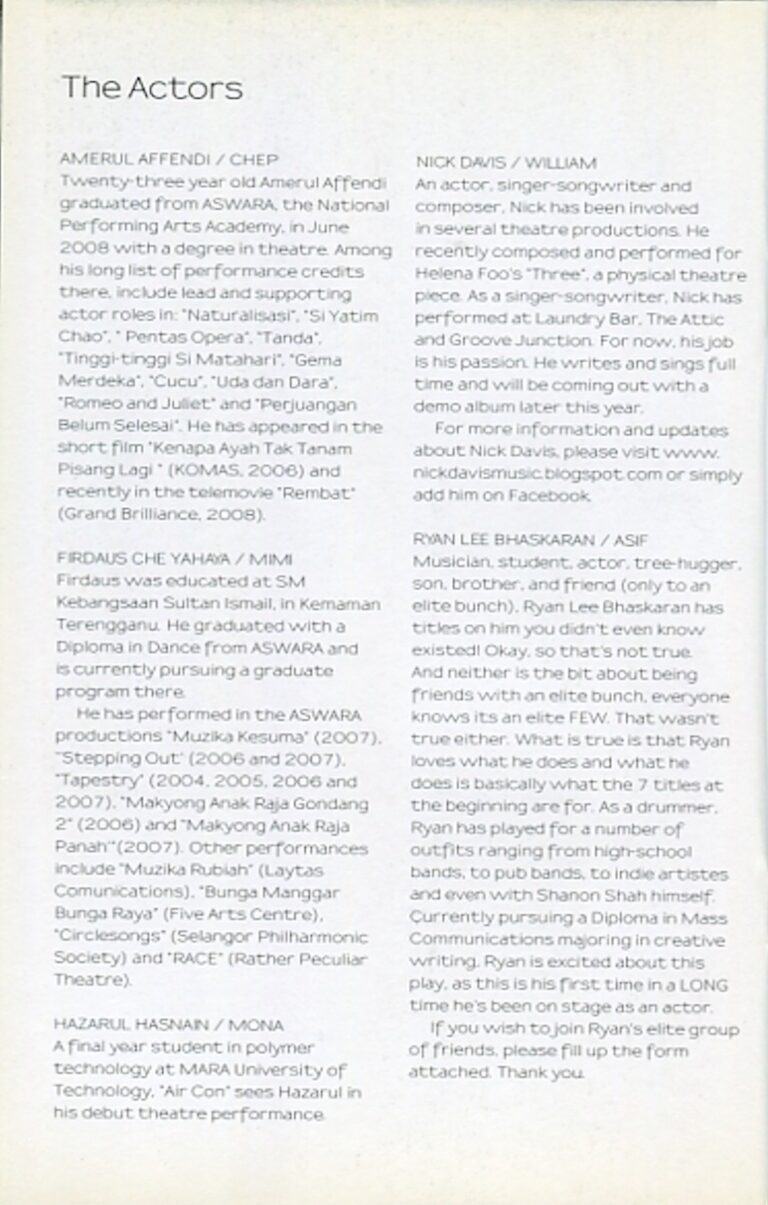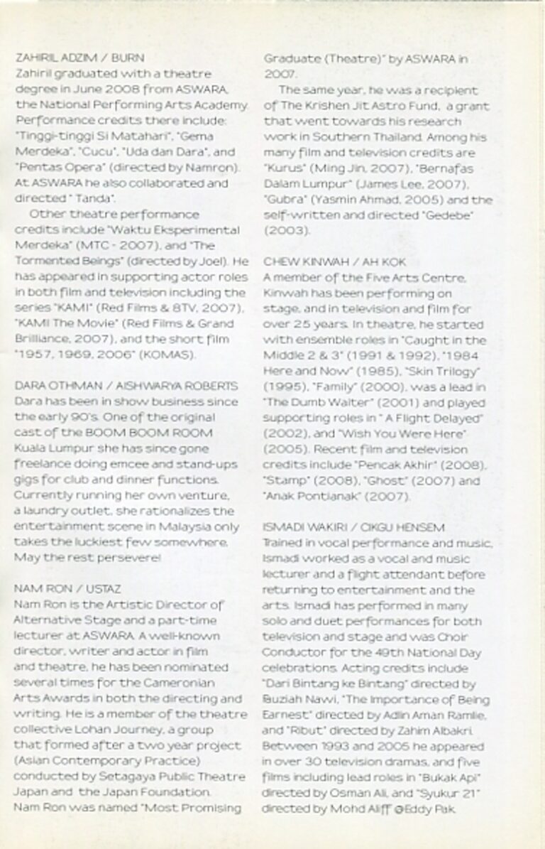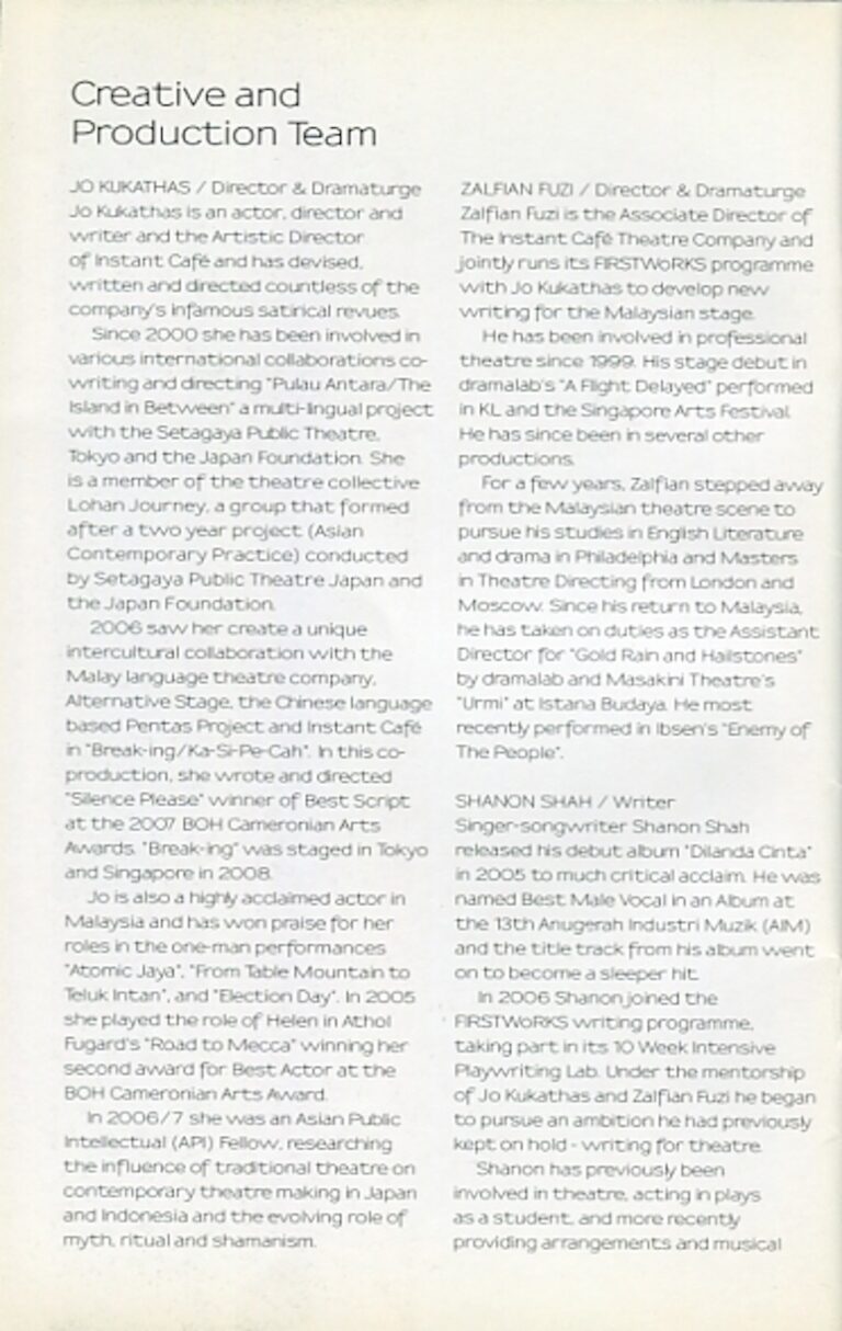 • Dramaturg:Jo Kukathas and Zalfian Fuzi