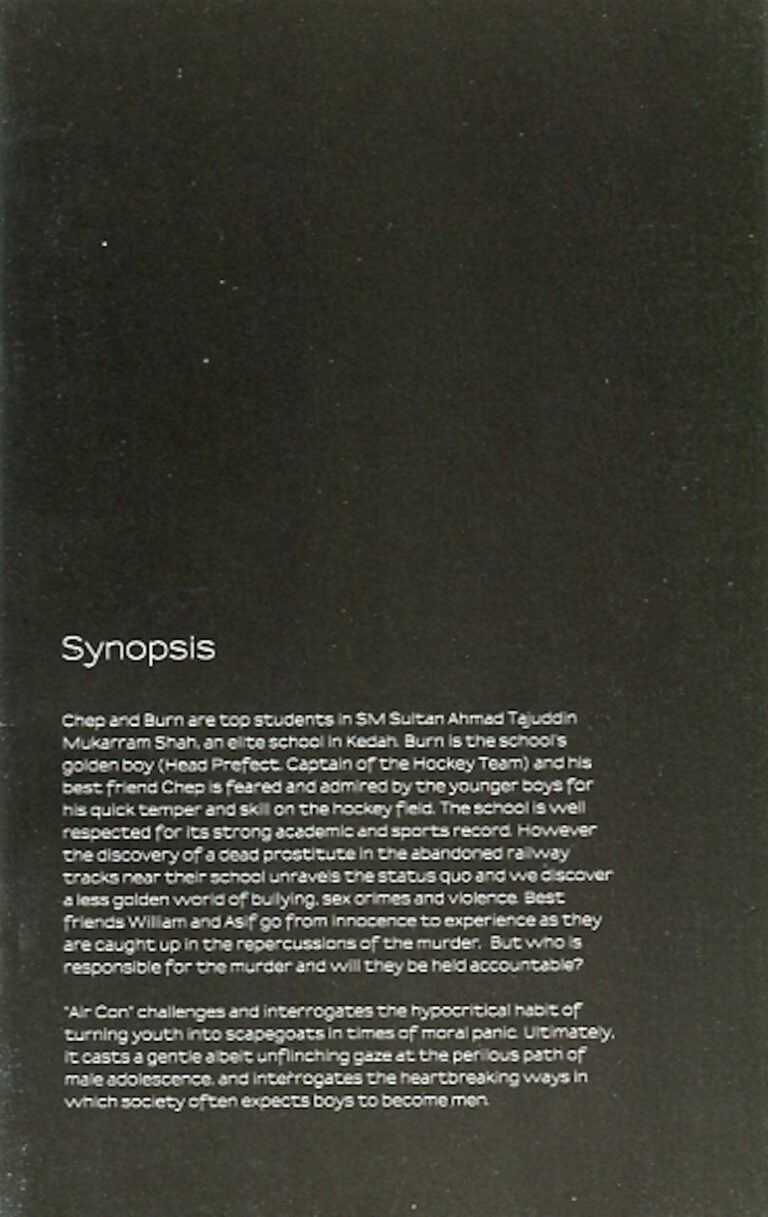 Chep and Burn are top students in SM Sultan Ahmad Tajuddin Mukarram Shah, an elite school in Kedah. Burn is the school’s golden boy (Head Prefect, Captain of the Hockey Team) and his best friend Chep is feared and admired by the younger boys for his quick temper and skills on the hockey field. The school is well respected for its strong academic and sports record. However the discovery of a dead prostitute in the abandoned railway tracks near their school unravels the status quo and we discover a less golden world of bullying, sex crimes and violence. Best friends William and Asif go from innocence to experience as they are caught up in the repercussions of the murder. But who is responsible for the murder and will they be held accountable?