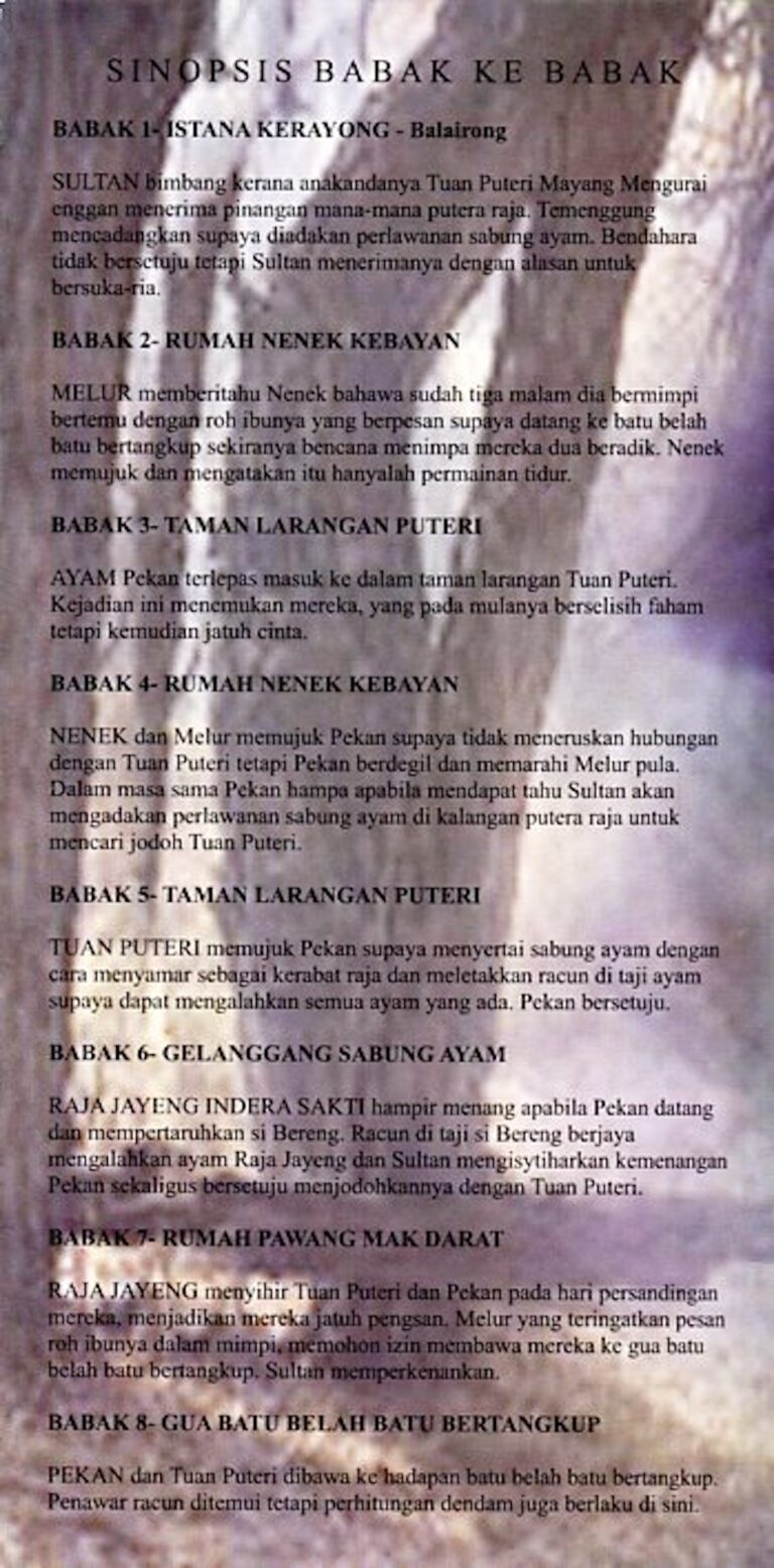 After abandoned by their mother, Pekan and Melur grew up under the care of Nenek Kebayan. While Pekan and the Princess Mayang Mengurai secretly knotted their love affair, at the meantime the King of Kerayong hold up a cock fight competition in search for a strong and brave prince for the Princess. The Princess ask Pekan to disguised himself as a prince, enter the competition and assured the winning by using a poisonous trick. The tragedy begin, when Raja Jayeng Indera Sakti, the loser in the competition, take a revenge.