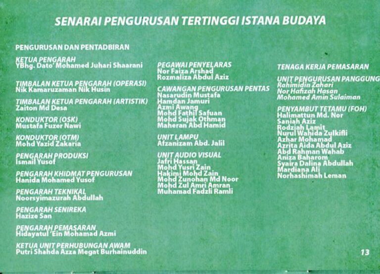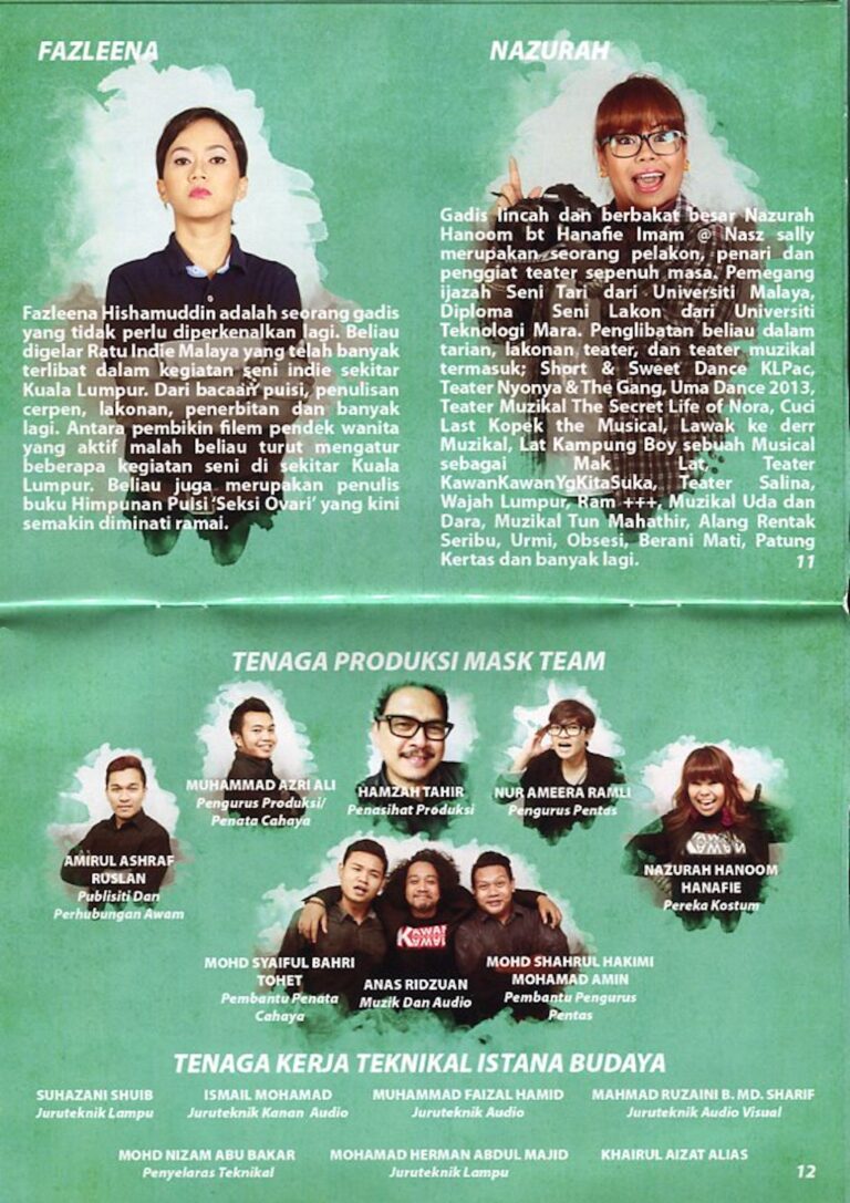 - Kru Pentas:Nasarudin Mustafa, Hamdan Jamuri, Azmi Awang, Mohd Fathil Safuan, Mohd Sujak Othman, Maheran Abd Hamid