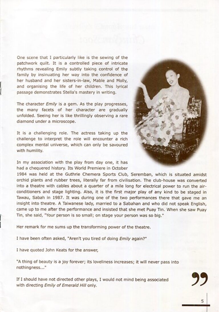 “The assuredness of a rooted past, springing from her Peranakan heritage, lends depth to Emily, easily the most convincing character who has so far appeared in Singapore English theatre. Kon’s evocation of an Asian and, therefore, transformable sense of time and space, in her bittersweet eulogy to a disappearing culture of the Straits Chinese, was a rare experience for the ethnically dispossessed and mostly young middle-class audience.”