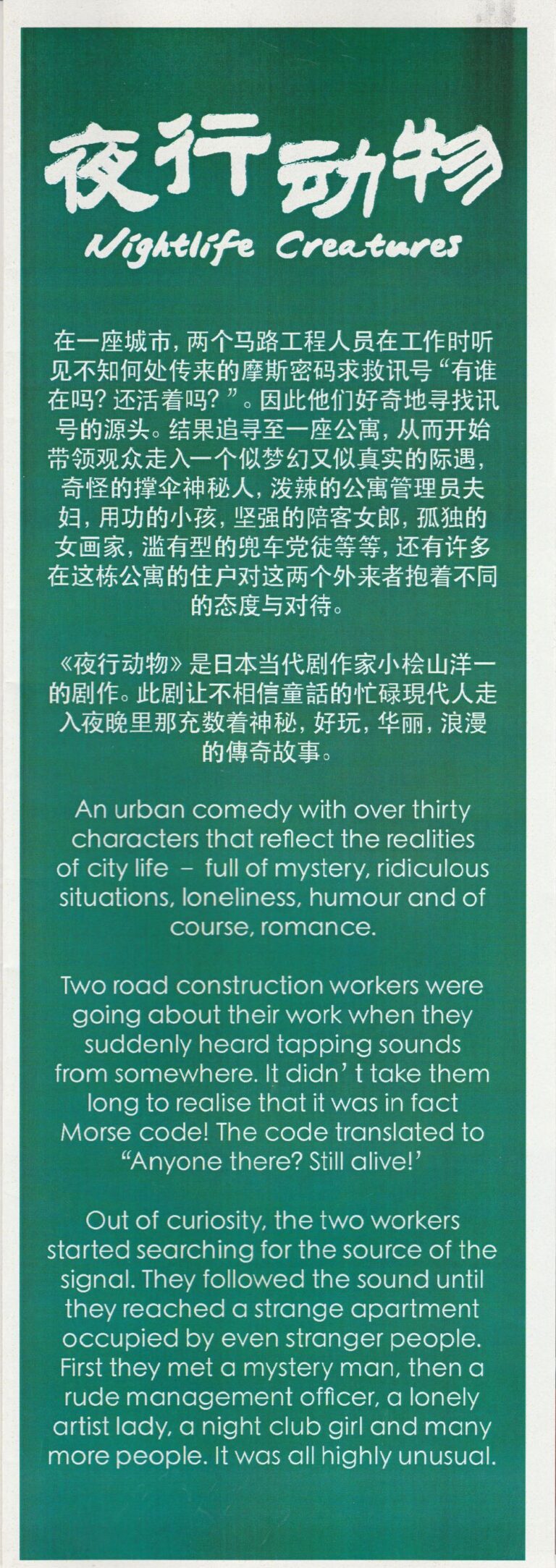《夜行動物》是日本當代劇作家小檜山洋一的劇著。此劇讓 不相信童話的忙碌現代人走入夜晚里充數著神秘,好玩,華 麗,浪漫的傳奇故事。